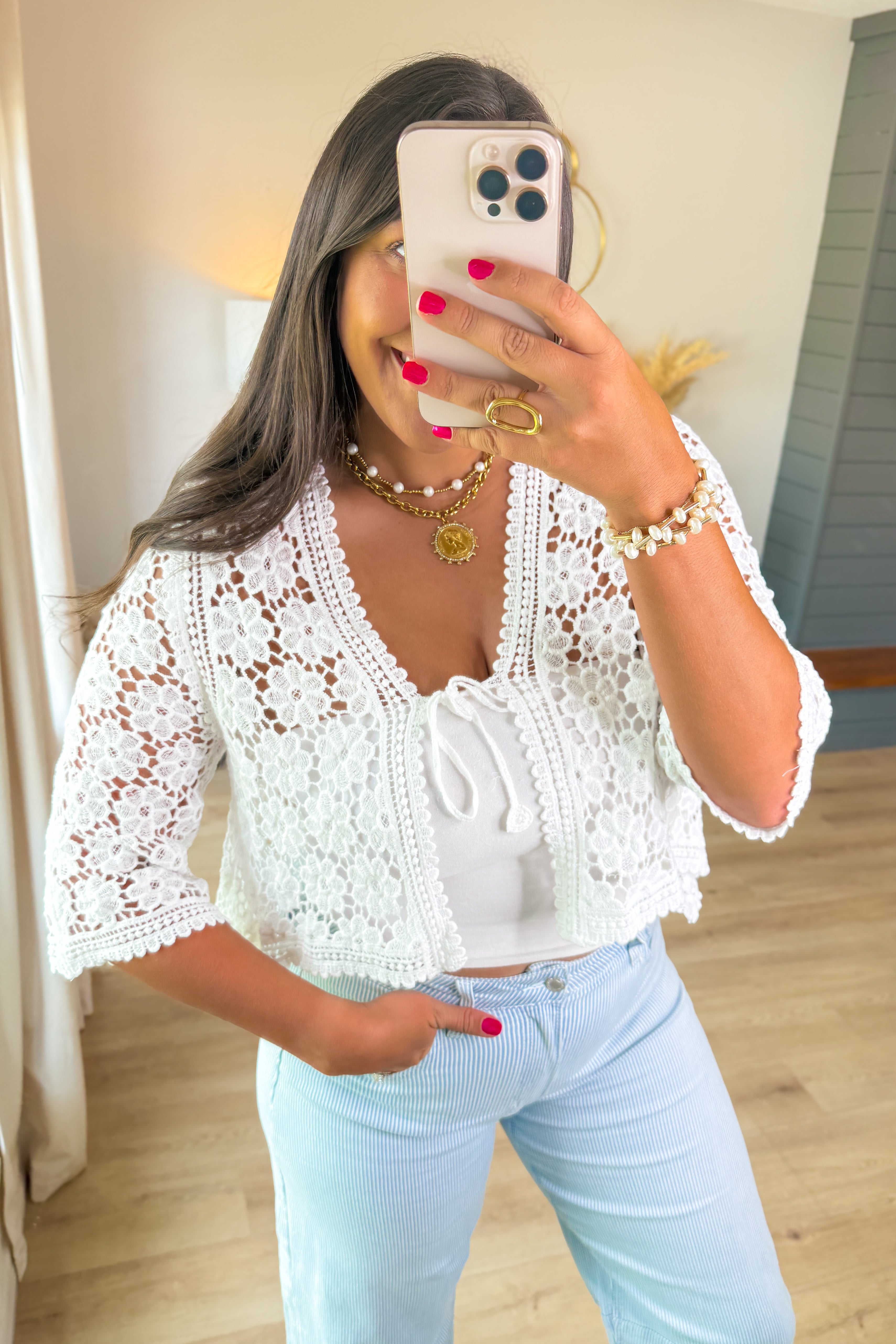 - This dreamy white crochet cardi features delicate floral eyelet detailing, scalloped hems, and a tie-front closure that adds the sweetest vintage charm. Lightweight and feminine, it's the perfect piece to throw over your favorite tank or dress for that effortlessly polished, cottagecore-inspired look.