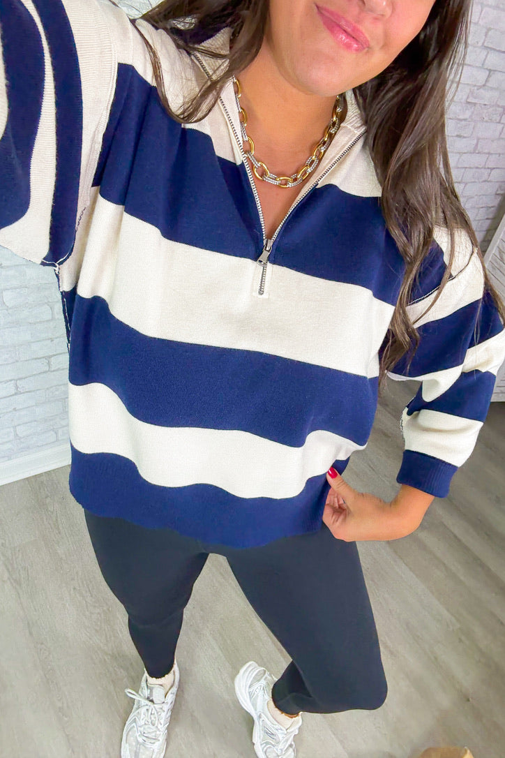 - Classic striped half zip sweater with a relaxed, easy fit.
