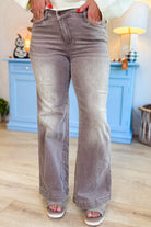 - These Judy Blue jeans feature a rich mocha wash with an on-trend asymmetrical button detail that sets them apart. The flattering flare leg elongates your silhouette while the soft, stretchy denim ensures all-day comfort.