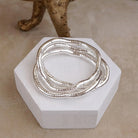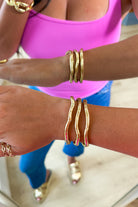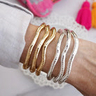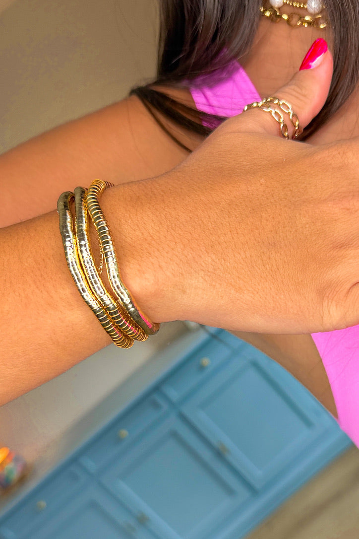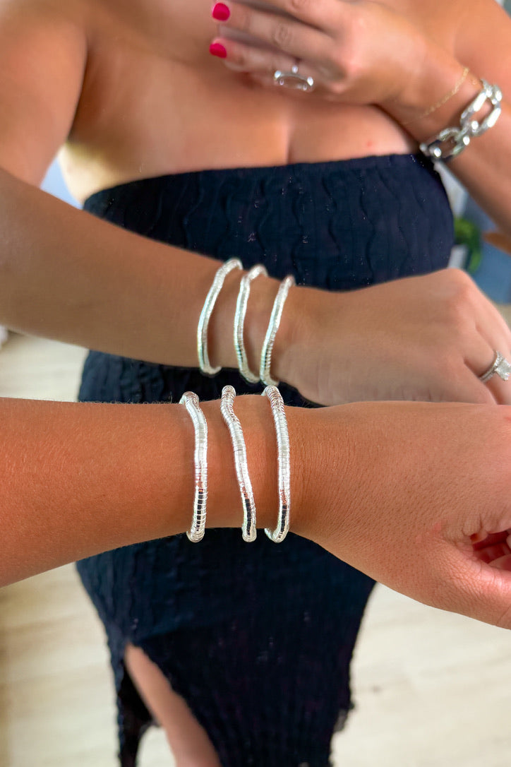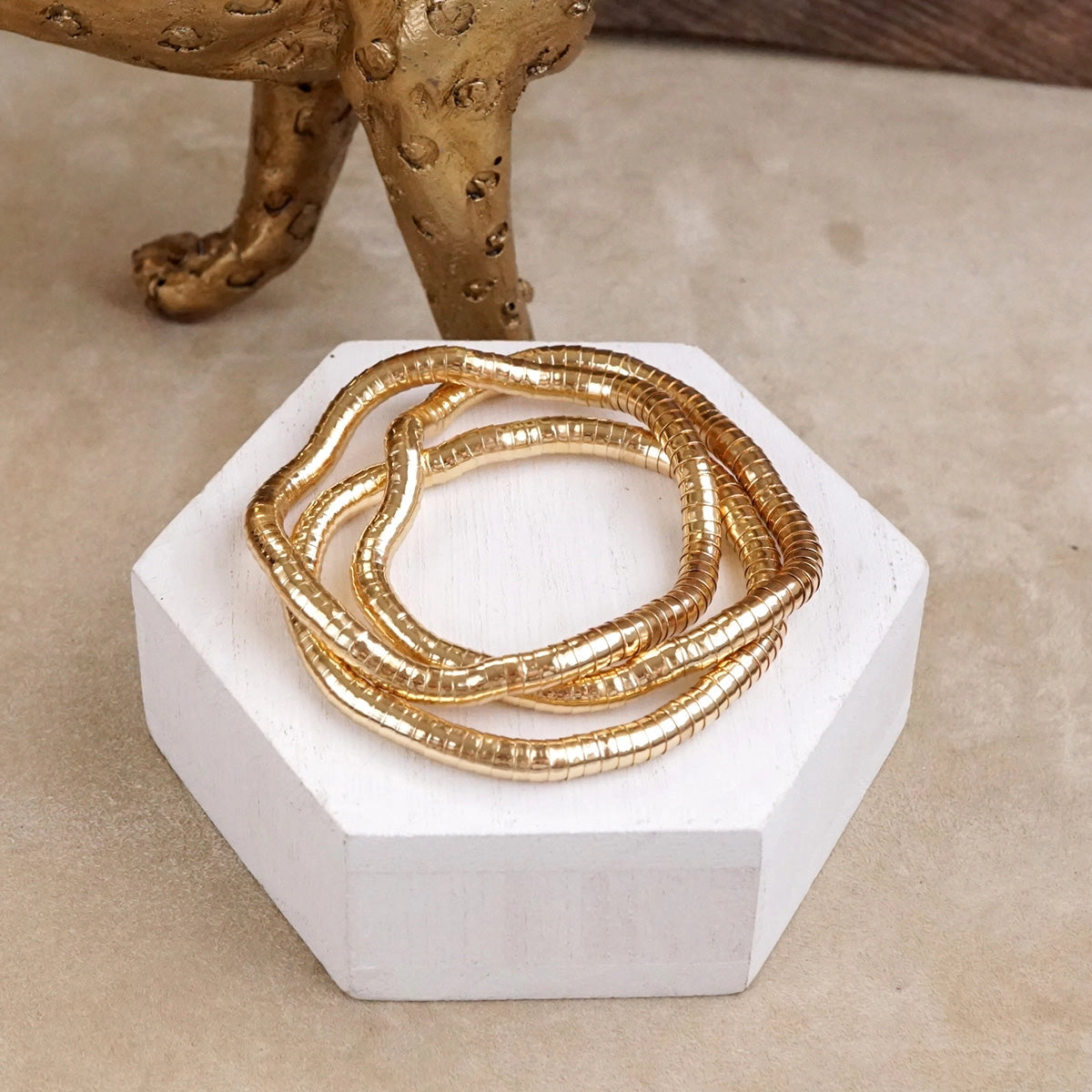 - Slinky, stackable, and effortlessly cool—The Wavy Stack Bracelet Set includes three stretchy, textured bangles in your choice of gold or silver. Lightweight and easy to mix and match, these add a pop of shine to any look.